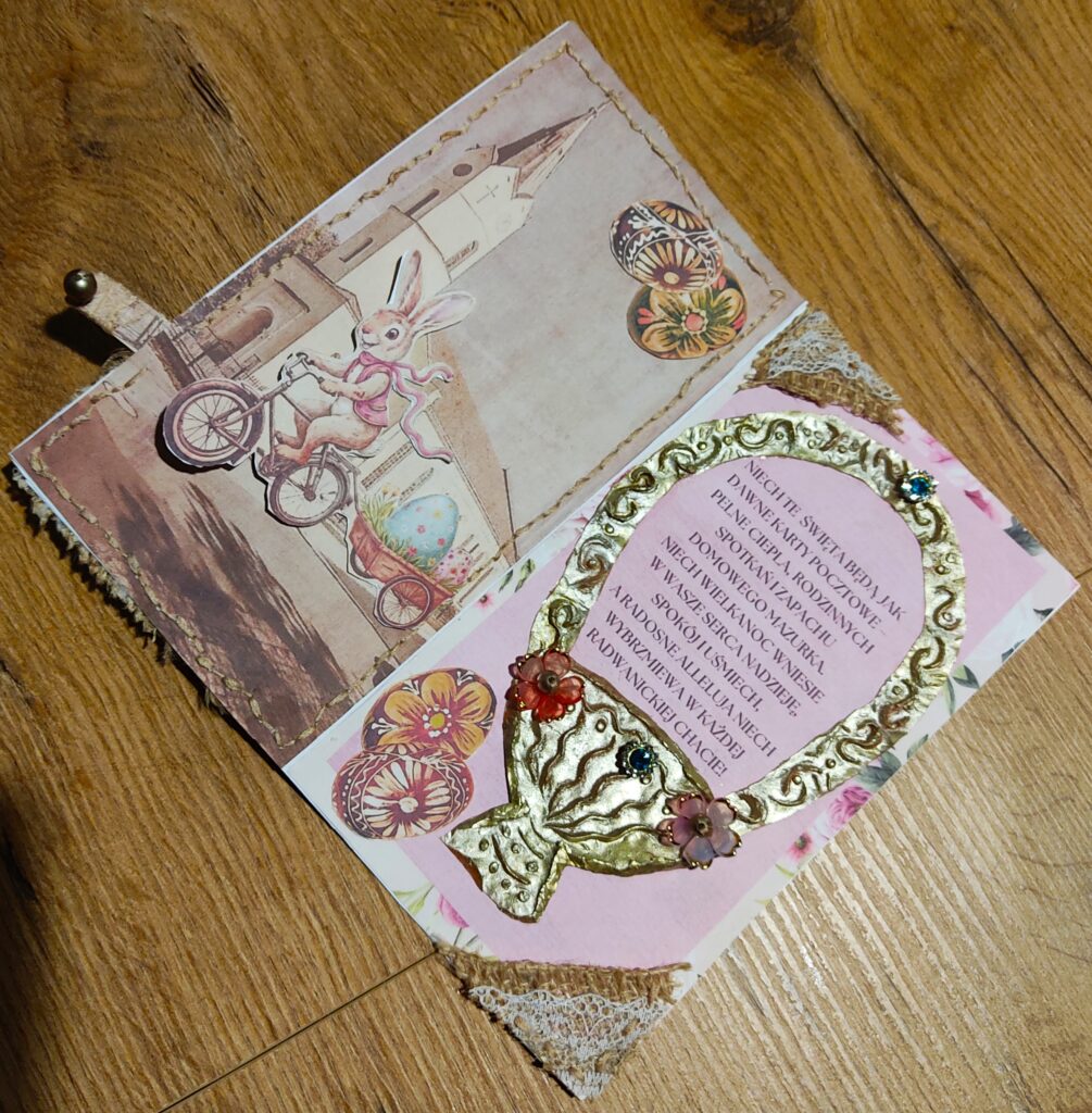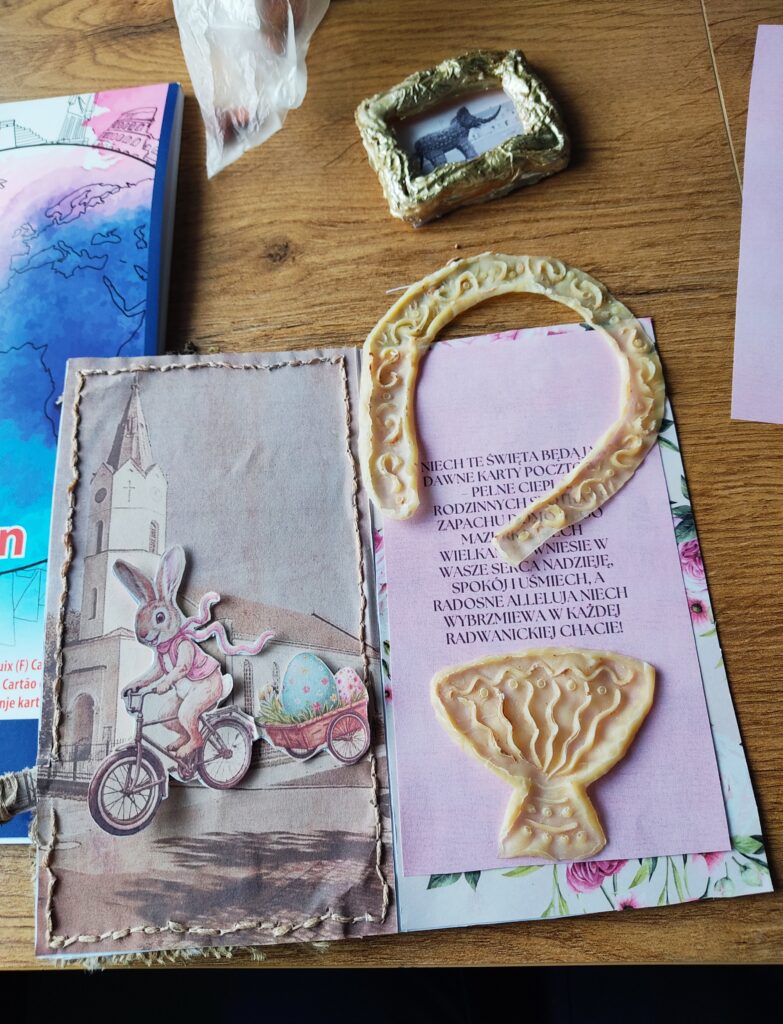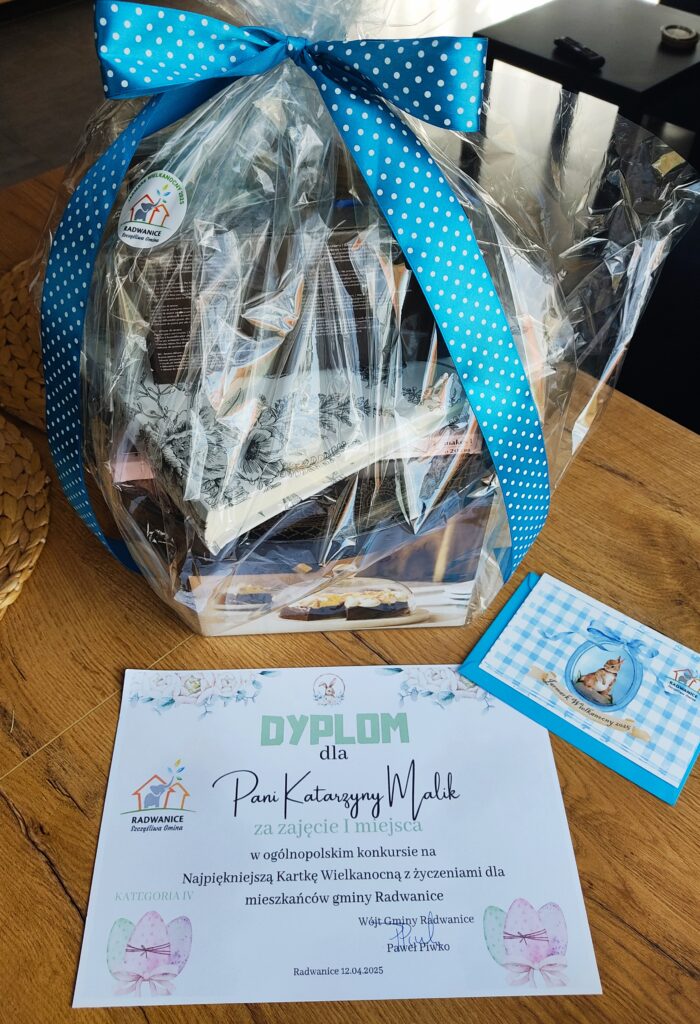 Chciałabym się podzielić czymś, co jest dla mnie naprawdę wyjątkowe z pasji tworzenia powstała moja pierwsza w życiu kartka wielkanocna z życzeniami dla mieszkańców naszej Gminy Radwanice i zgłosiłam ją na ogólnopolski konkurs. Kartka powstała w stylu retro vintage – Każdy jej element narodził się z wyobraźni i pracy rąk z nutką nostalgii. Podczas pracy wykorzystałam techniki z charakteryzacji, samodzielnie zaprojektowałam i wykonałam wzór oraz odlew ramki i koszyczka. Każdy element miał swoją historię.