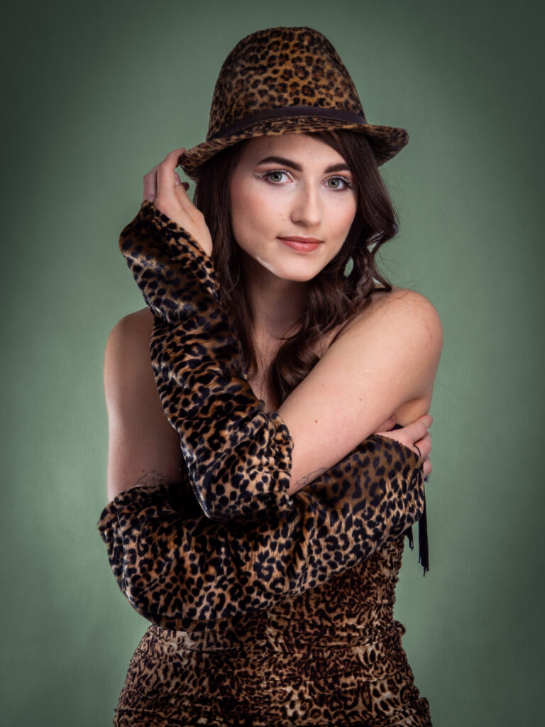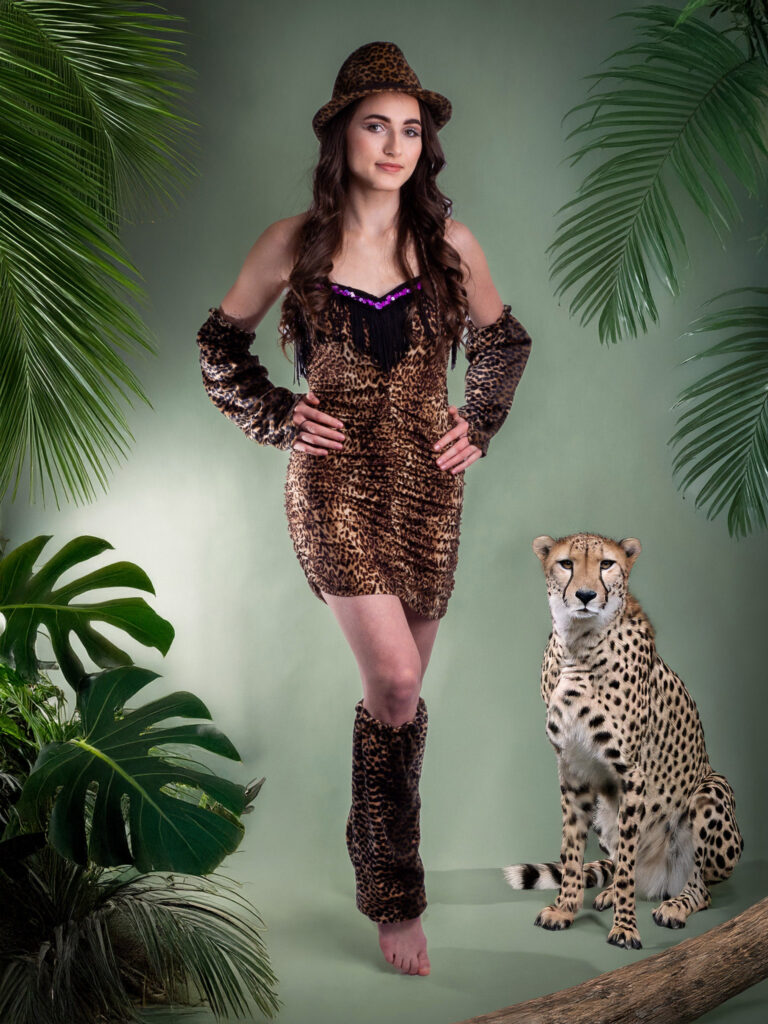 Ta stylizacja to prawdziwy hit dla miłośników odważnych wzorów. Sukienka w panterkowy print z efektownymi frędzlami podkreśla sylwetkę, a dopasowane dodatki – rękawiczki, nakrycie głowy i ocieplacze na nogi – dodają jej charakteru. To połączenie kobiecości z drapieżnym stylem, które świetnie sprawdzi się na imprezy tematyczne czy sesje zdjęciowe.